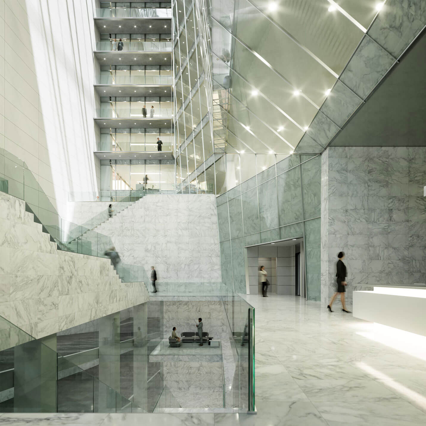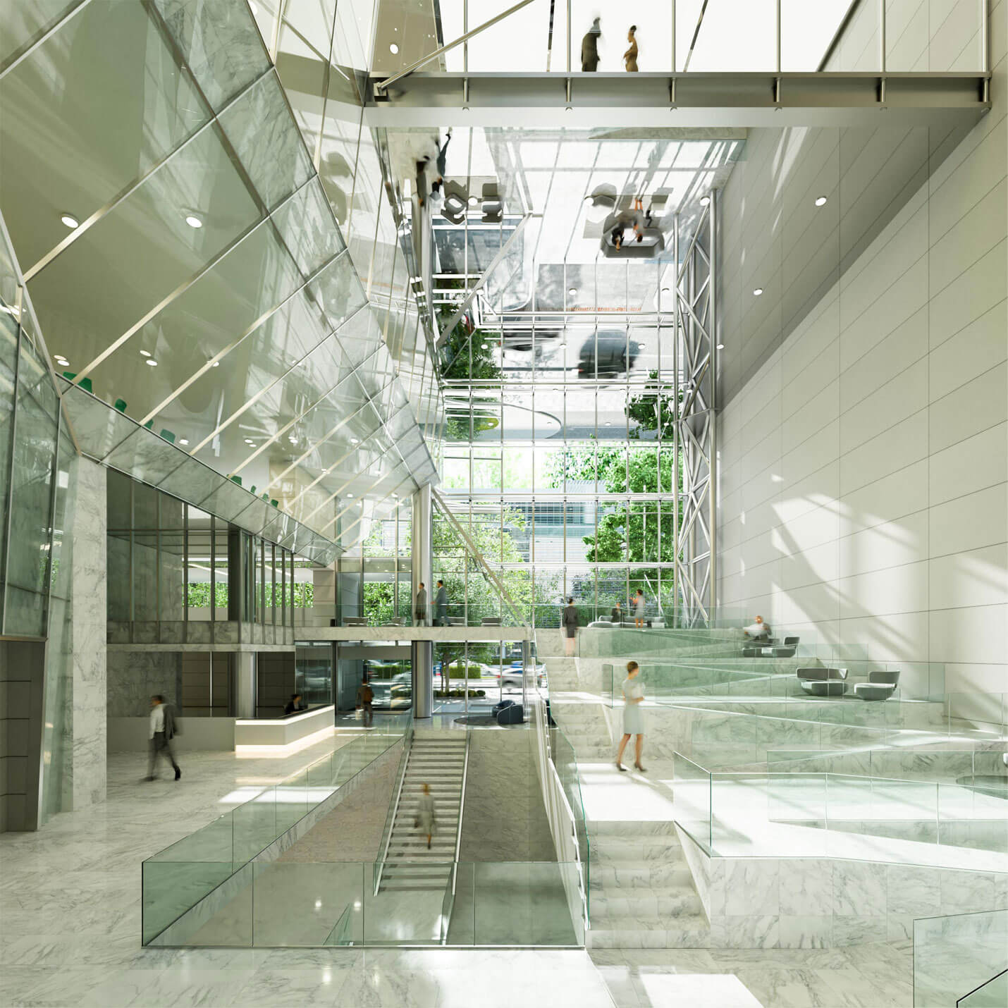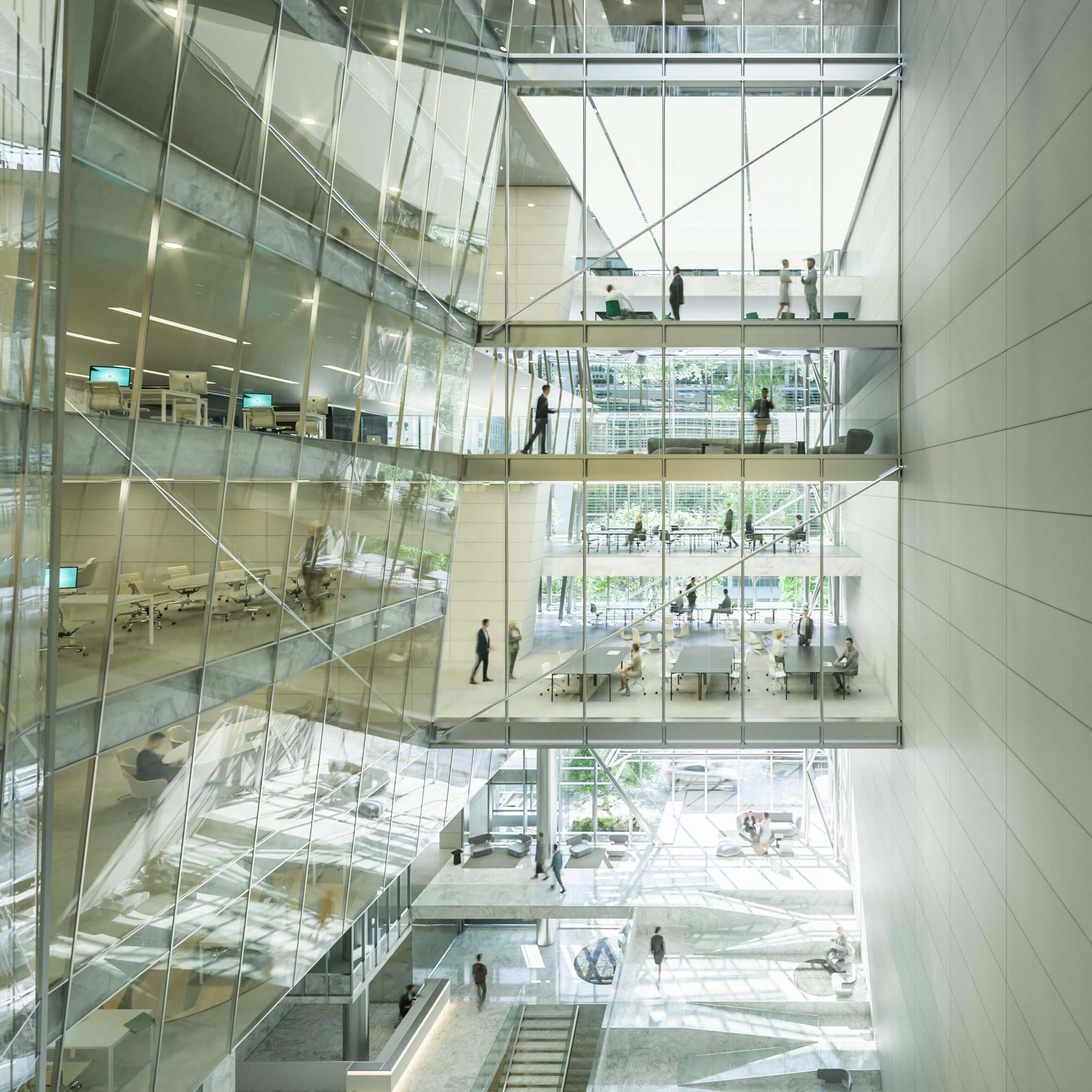 The light filled atrium, glass structure spanning 1875 Penn, and updated interior façade create physical and visible connections across floor plates